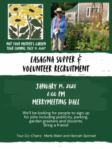 Join us on January 15, 2026, at 6:00 pm in Merrymeeting Hall to enjoy a lasagna supper and learn about the many opportunities for participating in the success of the 2026 Not Your Mother’s Garden Tour (coming July 11). We’ll be looking for people to help us: